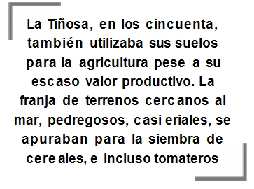 La Tiñosa, en los cincuenta, también utilizaba sus suelos para la agricultura pese a su escaso valor productivo. La franja de terrenos cercanos al mar, pedregosos, casi eriales, se apuraban para la siembra de cereales, e incluso tomateros. El territorio agrícola en explotación más extenso pertenecía a la familia de Flora Rodríguez López, co