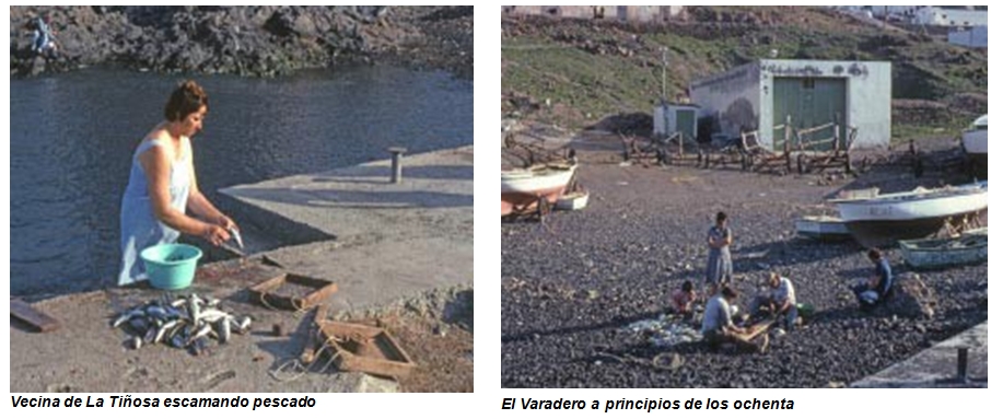 Con la llegada de las primeras luces del día, los pequeños botes llegaban a la orilla del Varadero con sus capturas, al mismo tiempo que las mujeres bajaban hasta la marea a recoger los peces. Metían el pescado en ceretas y lo cargaban a la cabeza de una forma organizada. Lo transportaban desde La Tiñosa hasta varios puntos del municipio, donde tenían señalados los puestos de venta del pescado. A veces se pagaba en metálico y, otras, por medio del trueque de productos del campo. Estas señoras jugaban un papel importante en la vida del pueblo, por lo que merecen ser citadas, entre otras: Lola Santana, Serafina, Domitila, María, Trina, Eladia, Isabel, Hipólita… Luego vendría la venta a burro, siendo célebre Antonia Pino. Posteriormente, los primeros vendedores de pescado a coche, con su reconocible pita en la puerta de las casas del interior, que fueron renovando las condiciones de este sacrificado oficio.