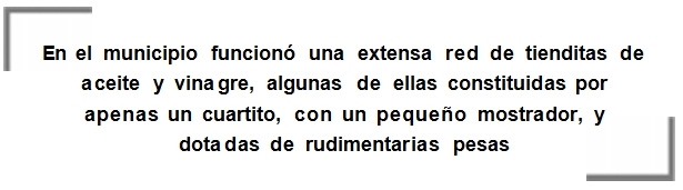 En el municipio funcionó una extensa red de tienditas de aceite y vinagre, algunas de ellas constituidas por apenas un cuartito, con un pequeño mostrador, y dotadas de rudimentarias pesas. A finales de los cincuenta va mejorando su infraestructura, con balanza Dina, báscula y hasta la chapa publicitaria de algún refresco en su puerta. Todas llevan el nombre de su propietario. En muchas existía el despacho obligado de algún vino, y todas servían como el punto de encuentro social de la época.