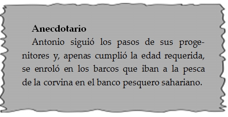 Este matrimonio, natural de La Tiñosa, tuvo 12 hijos, once varones y una hembra, y siempre vivieron en este pueblo con vocación marinera. Antonio siguió los pasos de sus progenitores y, apenas cumplió la edad requerida, se enroló en los barcos que iban a la pesca de la corvina en el banco pesquero sahariano.