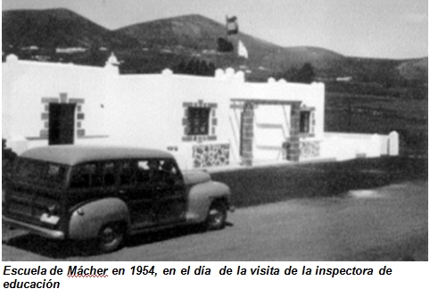 Llegada la mitad del pasado siglo, en 1953, la localidad de Mácher sería la primera del municipio en asistir a la inauguración de dos escuelas, una para niños y otra para niñas, con sus respectivas casas para maestros. En noviembre del mismo año, este grupo escolar recibe la visita del ministro de Educación, Sr. Ruiz Jiménez, quien promete al alcalde de Tías, Rafael Cedrés, la Cruz de Alfonso X El Sabio. Este grupo escolar mantuvo su actividad hasta 1995.