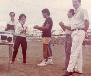 Normalizada la actividad ligada al centro escolar, con la participación de compañeros de otros centros, se confecciona y se presenta a la corporación municipal en el año 1.985 “Proyecto para la puesta en funcionamiento de las Escuela Municipal de Deportes del Ayuntamiento de Tías”. Considerábamos necesario ampliar la oferta más allá del fútbol y de la lucha canaria, bastante promocionados por las respectivas federaciones y apoyadas por el ayuntamiento. Si bien es cierto que este proyecto no cuenta, en un principio, con la aprobación, muy pronto es asumido con el total apoyo de la corporación. Planificamos con obsesiva prudencia la reforma y mejora de las instalaciones deportivas existentes que, rápidamente, fueron acometidas por el municipio. Algunas actividades deportivas monopolizaban el uso de muchas instalaciones y que, dicho sea de paso, no tardaron en ceder ante el incipiente proyecto. Se iniciaron las actividades de las escuelas municipales de atletismo, baloncesto, balonmano, lucha canaria y volibol. Resaltar que la lucha canaria ya contaba con bastante arraigo y que tantos éxitos estaban cosechando en este vernáculo deporte.