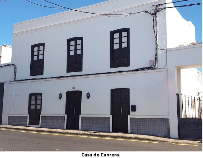 Cabrera, desde sus propiedades, transforma las veredas y caminos en el inicio de la traza organizada de las principales calles de La Tiñosa. La totalidad de la actual calle Roque Nublo está emplazada en su propiedad. También cedió suelo para construir el cuarto de despacho de agua procedente del aljibe del Cabildo, en el actual Centro Comercial Biosfera. Para la apertura de la calle de acceso a Los Afrechos, actual calle Teide, facilitó suelo y parte de la obra “El Castillo”. Facilitó suelo para el nuevo trazado de la carretera de La Tiñosa a Mácher, en el tramo inicial, en la actual calle Reina Sofía. Colaboró con los militares para ceder suelo y conectar la llegada de la carretera de Las Playas al pueblo de La Tiñosa. (Ver vuelo del fotograma de 1961 GRAFCAN). De la conexión anterior traza una calle desde el mar hasta el cruce con el inicio de la carretera que sube a Mácher, actual calle Bajamar. En ella construye unas nueve viviendas con cantos extraídos del Cerro de Tegoyo y de la cantera de Güime para alquilar a pescadores. Muchas de estas viviendas se quedaron sin encalar y constituyeron una imagen muy singular de cantos vistos. Las viviendas disponían de un zaguán, dormitorio con puertas hacia el frontis, cocina, retrete y un patio de cierre posterior. Después de la Guerra Civil fueron ocupadas por un destacamento militar. También en ese mismo vial, cedió dos solares para levantar las primeras escuelas otorgadas dentro del Plan Nacional de Construcciones Escolares. La de niñas y casa de la maestra se inaugura en julio de 1953. En el mismo acto se inaugura también el aljibe del Cabildo de 500 pipas. Para la entrada en funcionamiento de estas dos importantes obras se contó con la presencia del ministro de Educación Nacional, Joaquín Ruíz Jiménez. En el año 1957, en otro suelo cedido por Cabrera en esta misma calle, entra en funcionamiento la escuela de niños y casa del maestro, actual centro de mayores.
