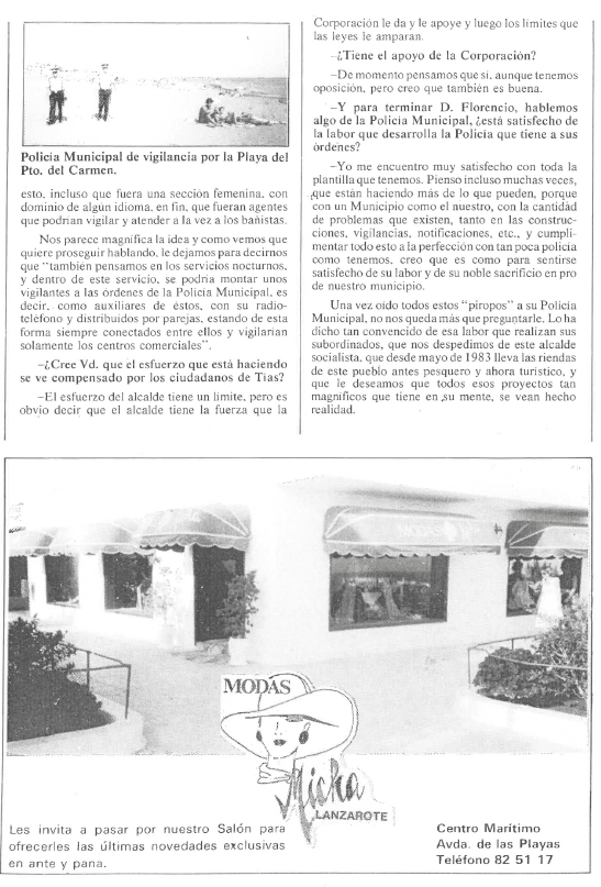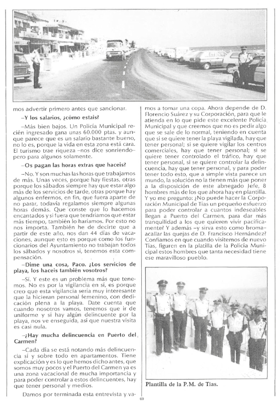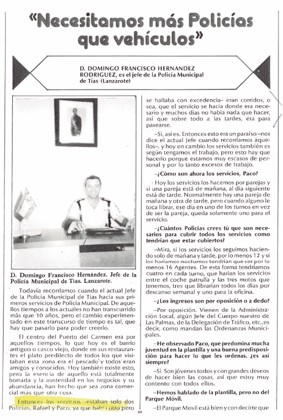 La Policía Municipal de Tías capta rápidamente la nueva situación sobrevenida provocada por el desarrollismo y en tiempo récord, con mucha voluntad y esfuerzo, sabe organizarse para actuar en el nuevo contexto social e ir reconduciendo los malos hábitos introducidos que provocan actos delictivos: Se crean diferentes unidades organizativas de actuación obteniendo excelentes resultados de forma inmediata y la Policía de Tías pasa a primer plano de referencia y de eficacia ganándose en un corto espacio la estima y excelente valoración por parte de los medios de comunicación y la sociedad de Lanzarote en general. Sin su aportación, la evolución de la zona turística de Tías se hubiese resentido.