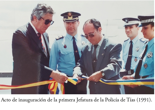 En el año 1991 el Ayuntamiento de Tías inaugura la nueva Jefatura de la Policía Municipal de Tías, situado en la planta alta de un edificio de dos alturas con las justas dependencias en la parte posterior del edificio consistorial. La Jefatura dispone de una recepción, espacio administrativo, sala de transmisiones, atestados, salón de taquillas y pequeño espacio de esparcimiento entre turnos. Dispone de cuatro calabozos, únicos en la isla (a excepción de los calabozos de la Policía Nacional en Arrecife).