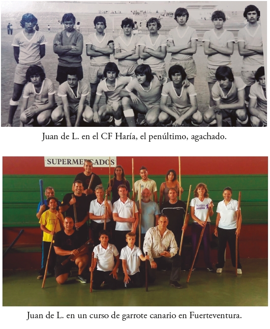 Juan de L. S. Juan de L. es natural del pueblo de Haría, donde se inicia como prometedor jugador de fútbol. Desde entonces es conocido por el seudónimo de Saro. En la temporada de 1973 el CF Haría queda subcampeón del torneo Lanzarote. Forma parte de la selección infantil de Lanzarote como destacado jugador en el puesto de interior polivalente.